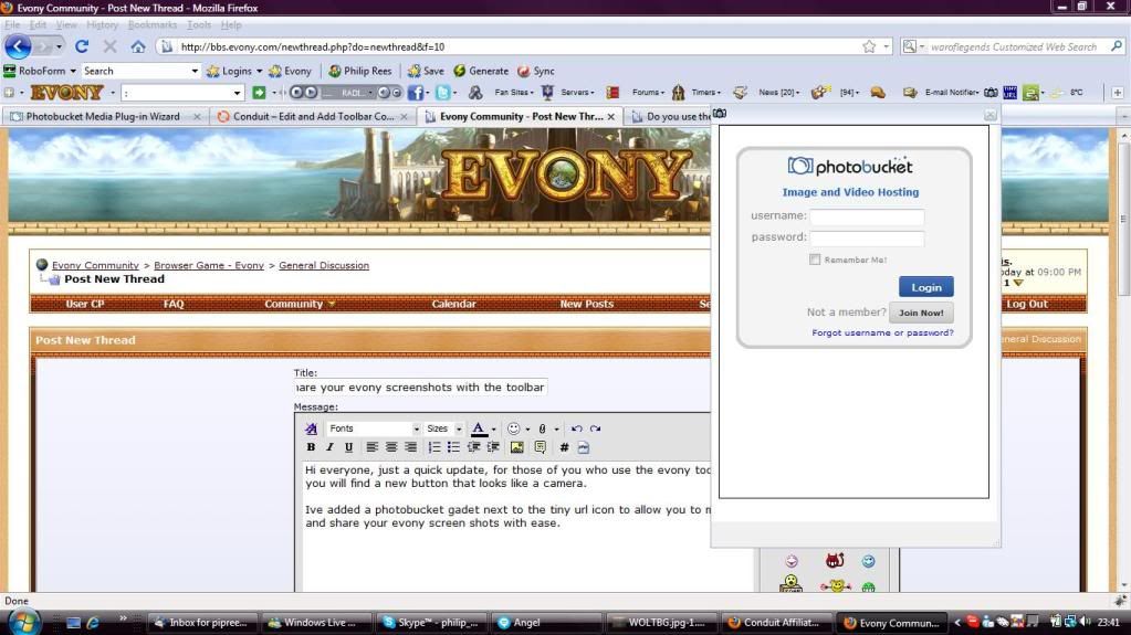 Ive added a photobucket gadet next to the tiny url icon to allow you to make and share your evony screen shots with ease.