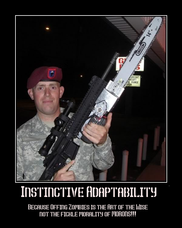 that's the problem with you serious Zombie connoisseurs. No sense of humor. But Oh damn put up an actual electric chainsaw, rail attached to a HK, or other weapon and and and it gets a .. scoff. and actual scoff?