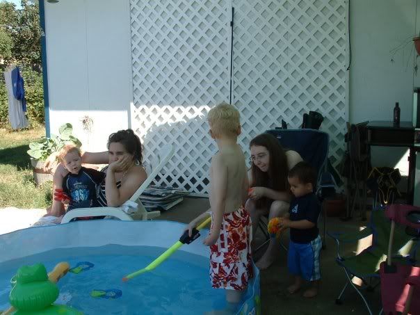 the tall one in the pool is my son, my sis and her son are sitting on the left, and my other sis's son is standing next to me. everyone else in my family tans, but i dont. only got in my swimsuit because they put a cannopy over the pattio